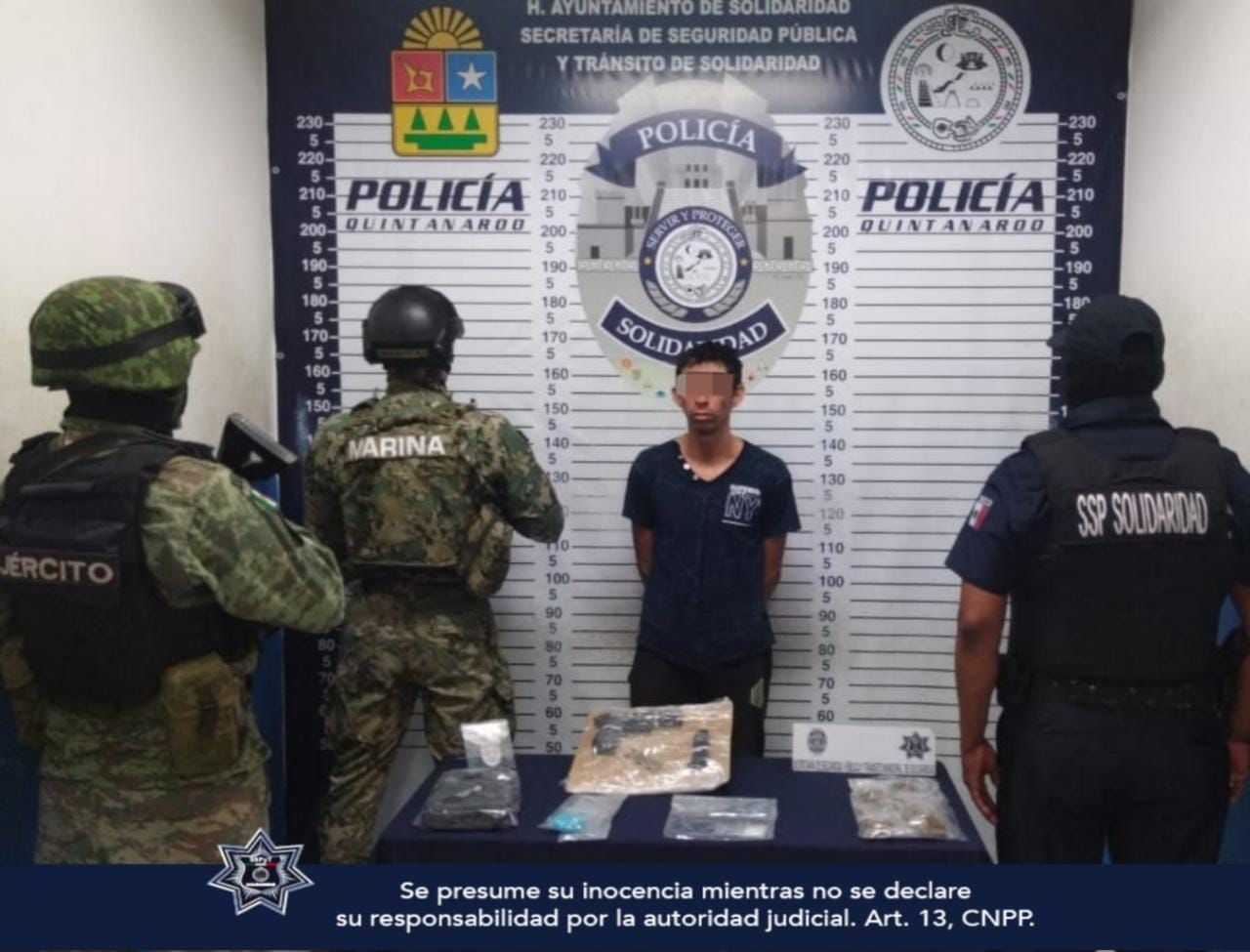 Playa del Carmen, Solidaridad.- Cuando implementaban labores de prevención y disuacion de delitos, elementos de la Secretaría de Seguridad Pública y Tránsito Municipal de Solidaridad y la MARINA y la SEDENA, aseguraron a una persona en posesión de un arma de fuego y posibles narcóticos en el fraccionamiento Villas del Sol.