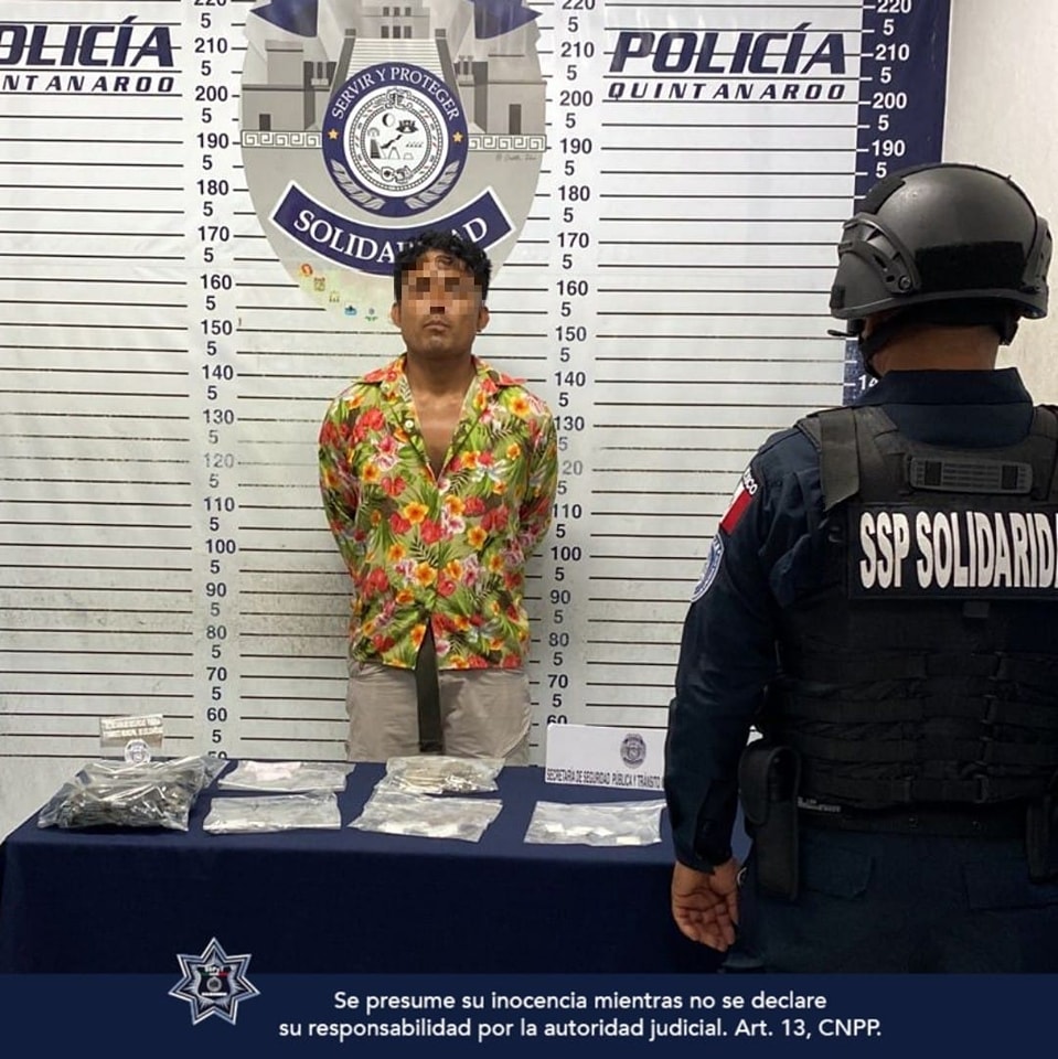 Playa del Carmen, Solidaridad .- Una persona fue asegurada en posesión de posibles narcóticos, por policías de la Secretaría de Seguridad Pública y Tránsito Municipal de Solidaridad, durante el operativo permanente de vigilancia en la zona Turística.