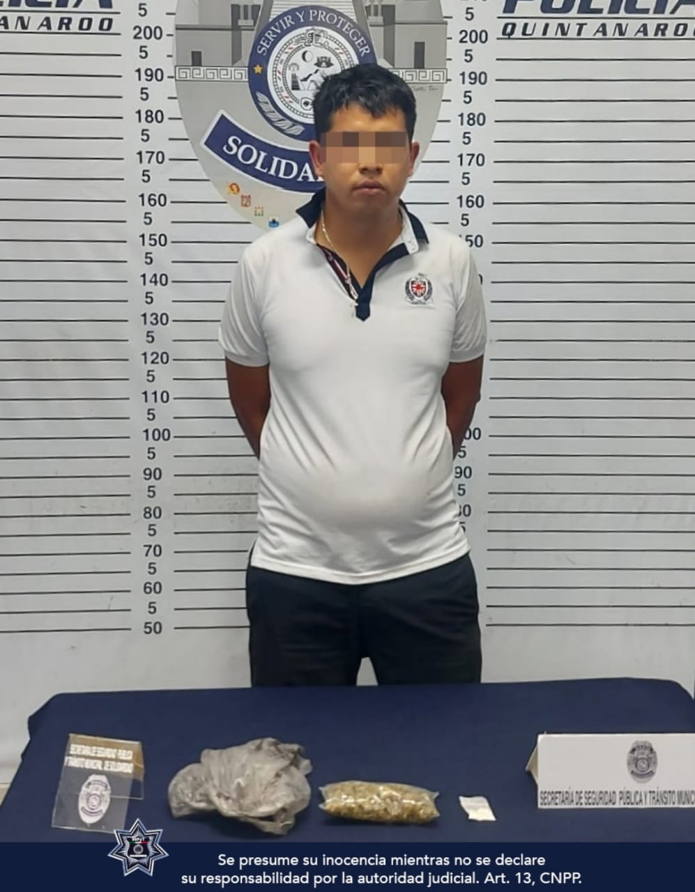 Playa del Carmen, Solidaridad.- Policías de la Secretaría de Seguridad Pública y Tránsito Municipal de Solidaridad aseguraron a un sujeto en posesión de posible marihuna, tras una persecución en el fraccionamiento el Pedregal.