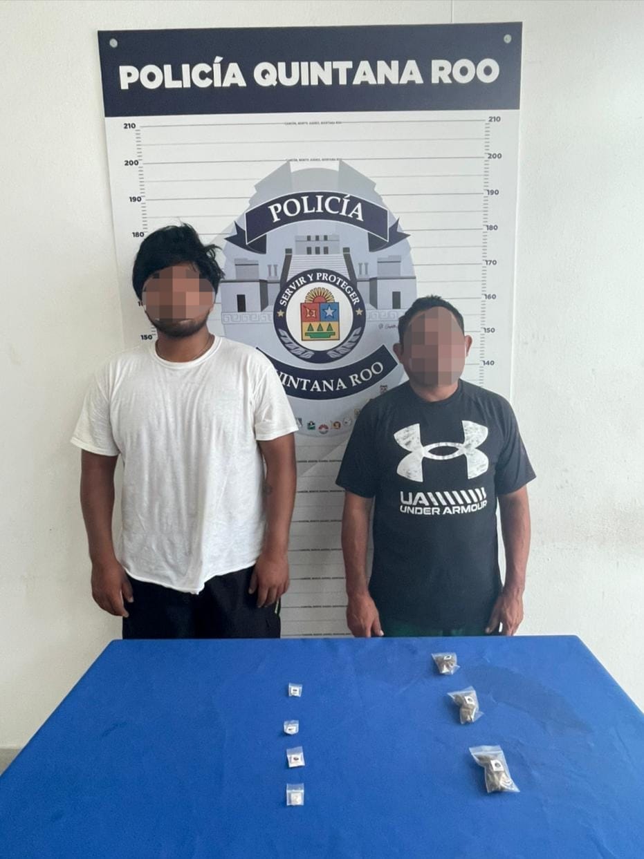Cancún, Quintana Roo.- Elementos de la Policía Quintana Roo Benito Juárez lograron la detención de Jaime José N., de 44 años, originario de la Yucatán, oficio albañil y de César Arturo N., de 22 años, originario de Cozumel, oficio vendedor, por delitos contra la salud.