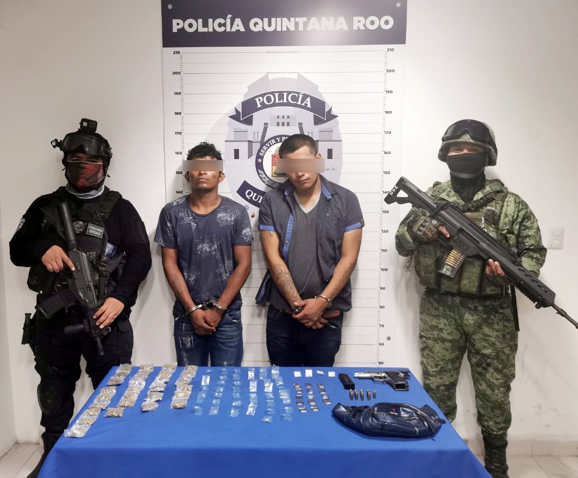 Cancún.- En una efectiva acción de reacción dentro del operativo “Benito Juárez Seguro”, elementos de la Policía Quintana Roo y de la Secretaría de la Defensa Nacional (SEDENA) lograron la detención de Joel N., de 28 años, originario de Tabasco, oficio albañil y de Francisco Javier N., de 20 años, originario de Tamaulipas, oficio pintor, por delitos contra la salud portación de armas y cartuchos de uso exclusivo de las Fuerzas Armadas.
