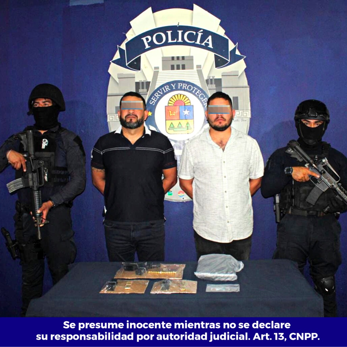 Cancún.- Elementos de la Secretaría de Seguridad Pública de Quintana Roo, lograron la detención de Pedro “N.” y Roman Enrique “N.”, por su presunta participación en el delito de desobediencia, resistencia de particulares, portación, fabricación, importación y acopio de armas prohibidas.
