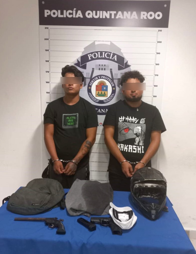 Cancún.- Elementos de la Policía Quintana Roo Benito Juárez lograron la detención de Antonio de Jesús N., de 33 años, originario de Tabasco, oficio músico y de Edwin N., de 19 años, originario de Tabasco ocupación obrero, por portación ilegal de arma de fuego.
