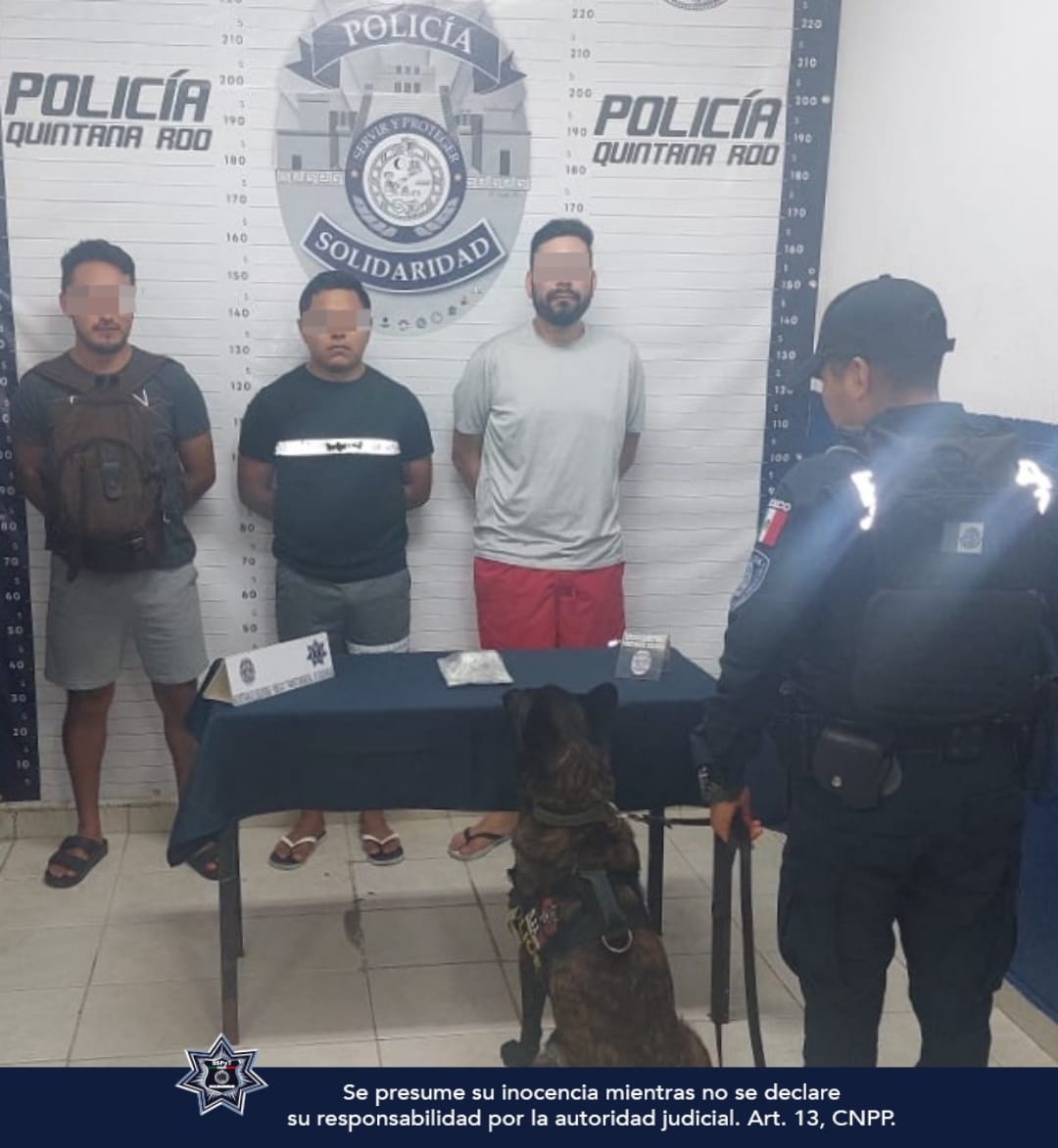 Playa del Carmen, Solidaridad .- Policías de la Secretaría de Seguridad Pública y Tránsito Municipal de Solidaridad aseguraron esta noche a cuatro sujetos por la comisión de delitos contra la salud al estar en posesión de posibles narcóticos, como parte del trabajo operativo diario que se realiza para mantener la paz y tranquilidad de los solidarenses.