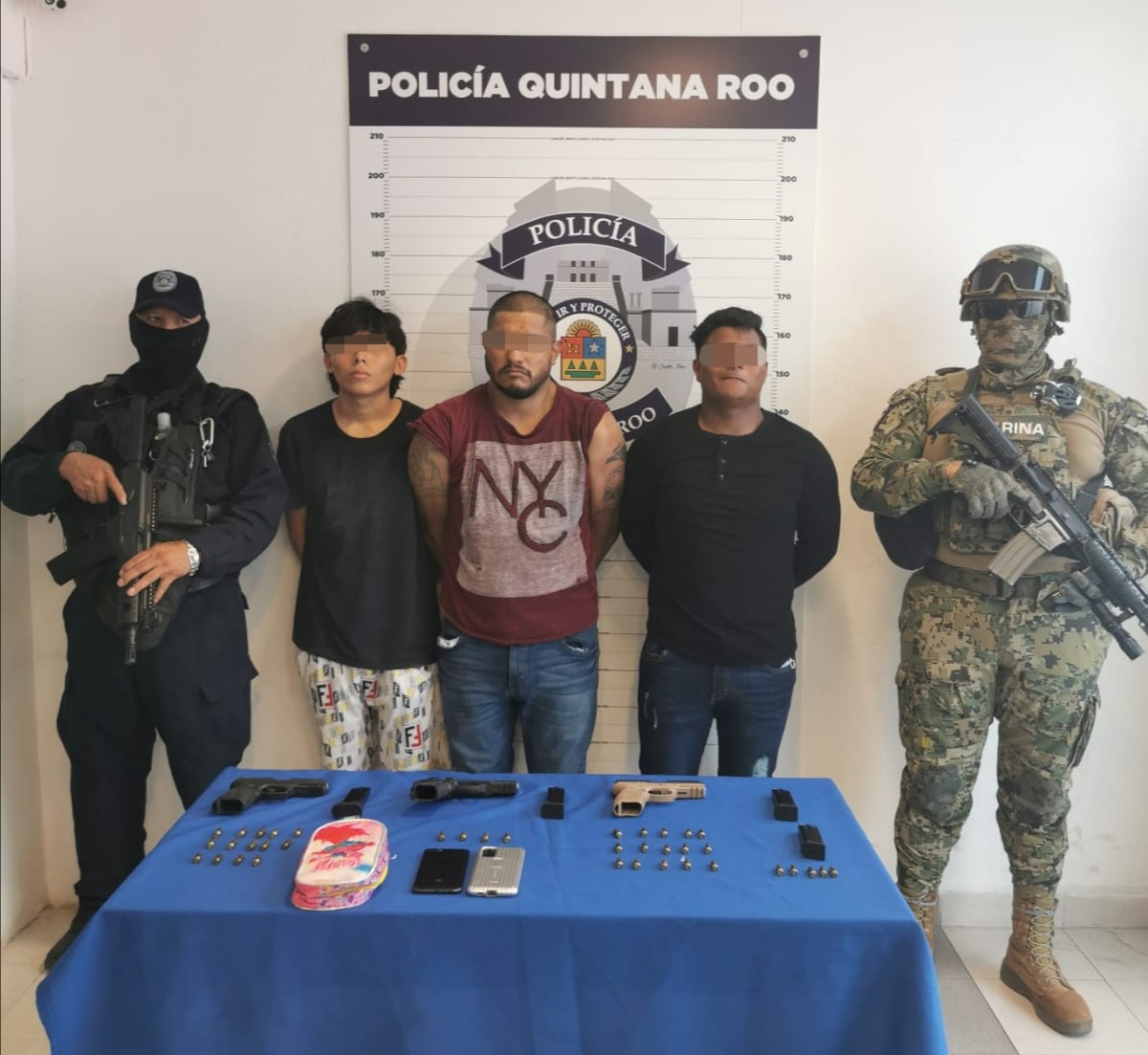 Cancún, Quintana Roo.- En un efectivo trabajo de coordinación entre la Policía Quintana Roo Benito Juárez, Secretaría de Marina (SEMAR) y de la Fiscalía General del Estado (FGE), se logró la detención de tres sujetos que participaron en un robo perpetrado con arma de fuego, en la Supermanzana 511.