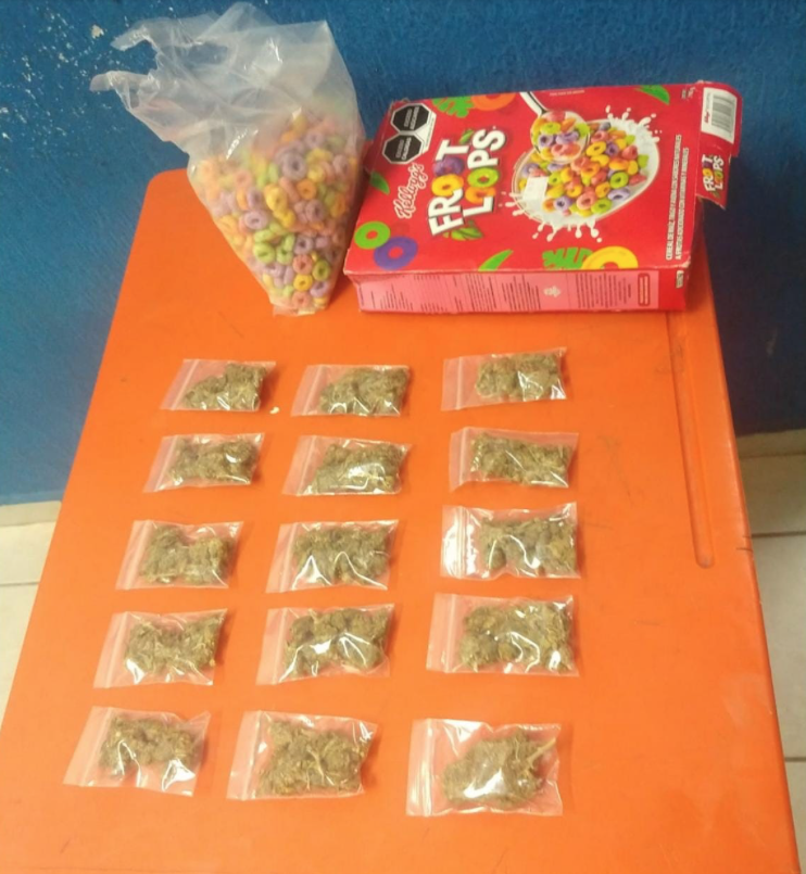 Tras la inspección se le encontró 15 bolsitas de plastico con marihuana que guarbada en una caja de cereal.
