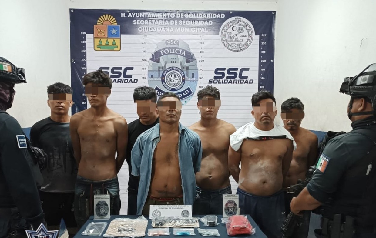 La pronta reacción de la Policía Preventiva permitió el aseguramiento de Antonio “N” de 40 años de edad, Víctor “N” de 20 años, Ángel “N” de 18 años y Mauricio “N” de 38 años originarios de Chiapas, así como Antonio “N” de 30, Reynaldo “N” de 28 años, procedentes de Bacalar y Silverio “N” de 29 años, originario de Yucatán, de igual forma aseguraron un arma de fuego, 22 cartuchos útiles y uno percutido, 16 envoltorios con la posible droga cristal, 7 con lo que parece piedra y 5 con posible marihuana.