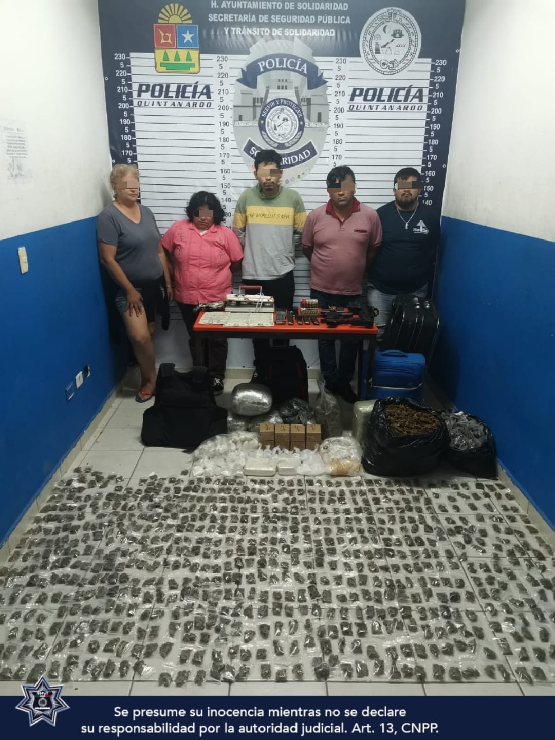 Playa del Carmen.- Policías de Solidaridad aseguraron a 5 sujetos durante la mañana de hoy viernes 18 de febrero en posesión de más de 2 mil bolsas con narcóticos, 2 armas de fuego y 180 cartuchos útiles en la colonia Galaxia del Carmen 2.