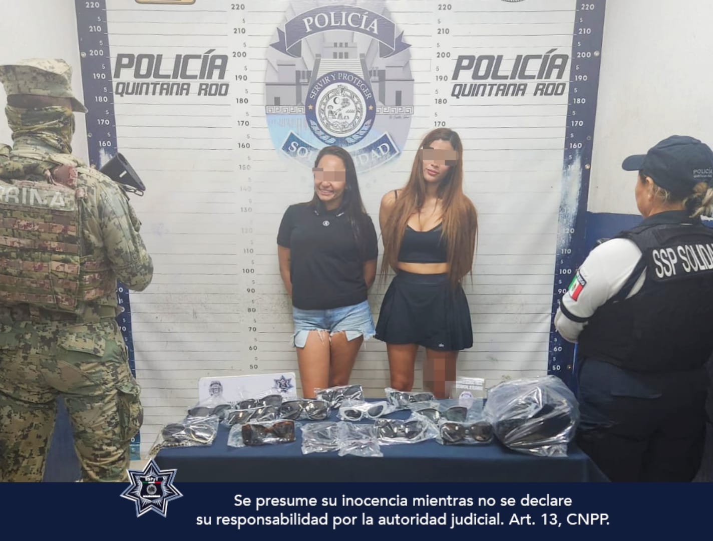 PLAYA DEL CARMEN.- Dos mujeres de origen colombiano fueron detenidas por la policía municipal sobre la Quinta Avenida, luego de haber presuntamente robado en un comercio de lentes de sol.