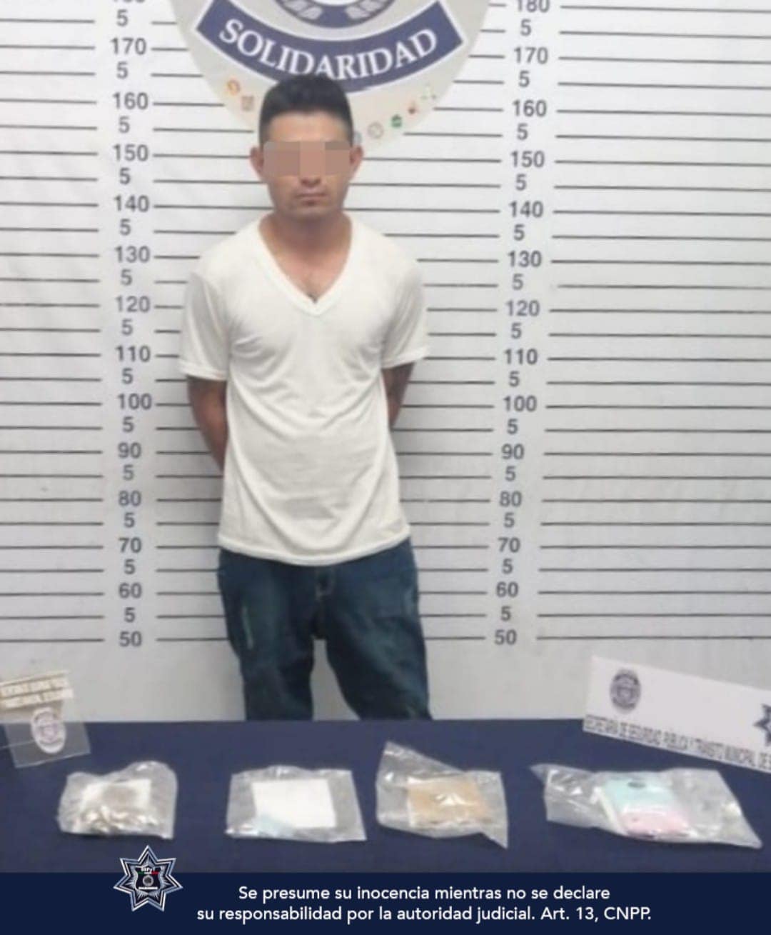 Un sujeto en posesión de posibles narcóticos y un cartucho útil, asegurado por policías de la Secretaría de Seguridad Pública y Tránsito Municipal de Solidaridad en un puesto de inspección preventiva aleatorio en la carretera del Sol entre el fraccionamiento Cristo Rey y la localidad de Nuevo Noh Bec.