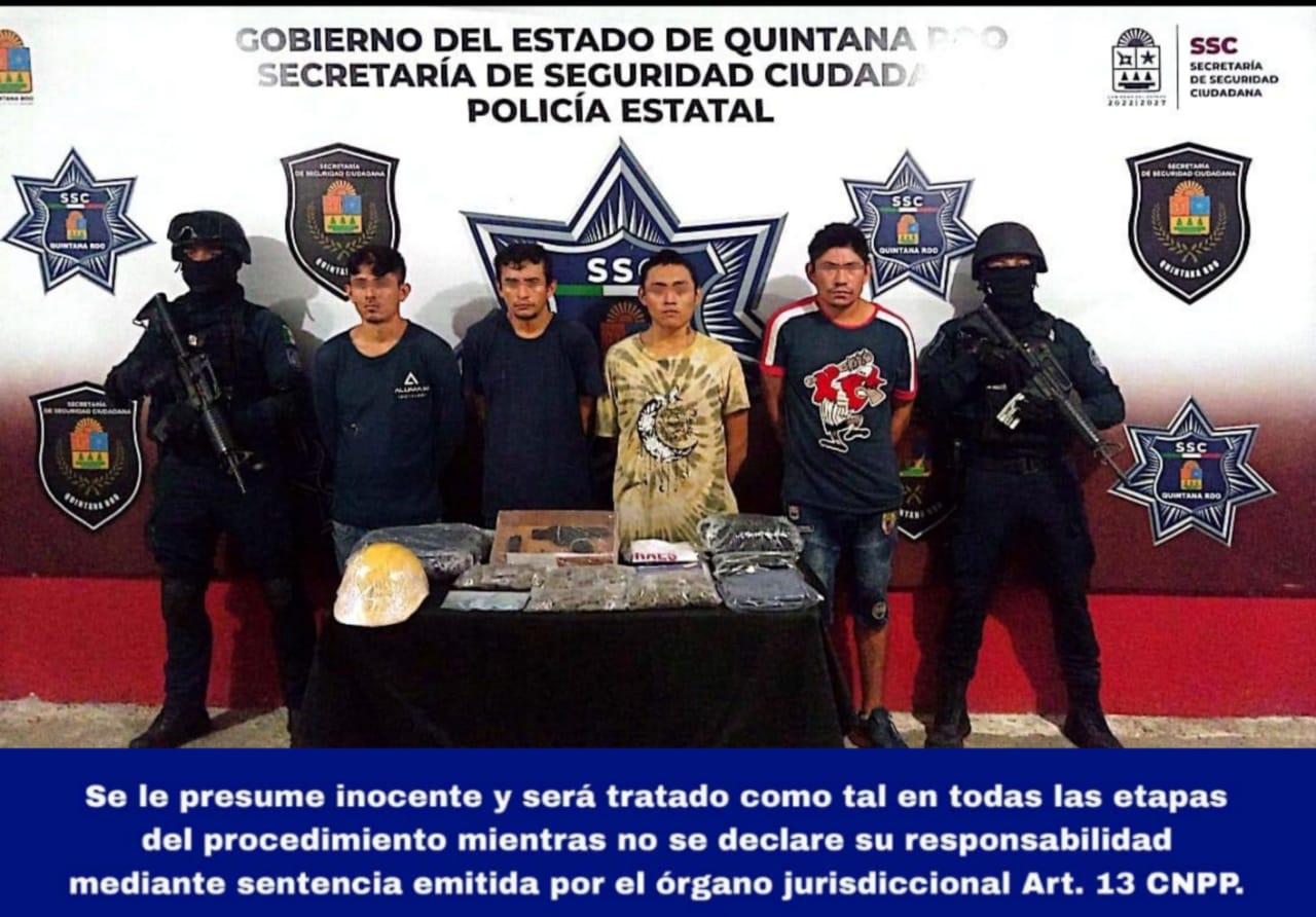 CANCÚN.- Fueron detenidos cuatro hombres en Cancún por delitos contra la salud y portación ilegal de arma de fuego; el operativo se registró en una zona cercana a la región 228.