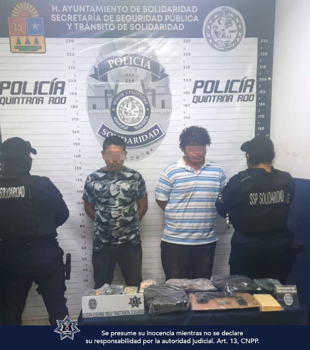 Playa del Carmen.- En una rápida respuesta a un auxilio ciudadano que refirió cobro de derecho de piso y extorsión, policías de la Secretaría de Seguridad Pública y Tránsito Municipal de Solidaridad aseguraron a dos sujetos, un arma de fuego y 51 envoltorios con posible droga como marihuana y cocaína.