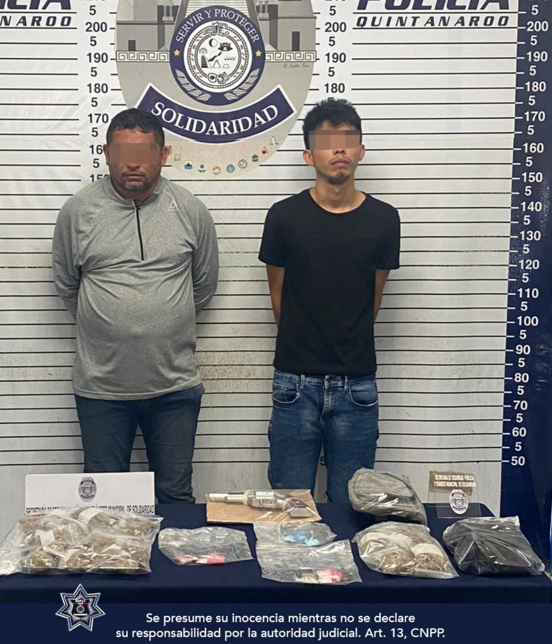 laya del Carmen, Solidaridad – Policías de la Secretaría de Seguridad Pública y Tránsito Municipal de Solidaridad aseguraron a dos sujetos en posesión de una réplica de arma de fuego, así como 70 bolsitas con posibles narcóticos como marihuana, cristal y cocaína, durante el operativo de vigilancia permanente en la colonia Bellavista.