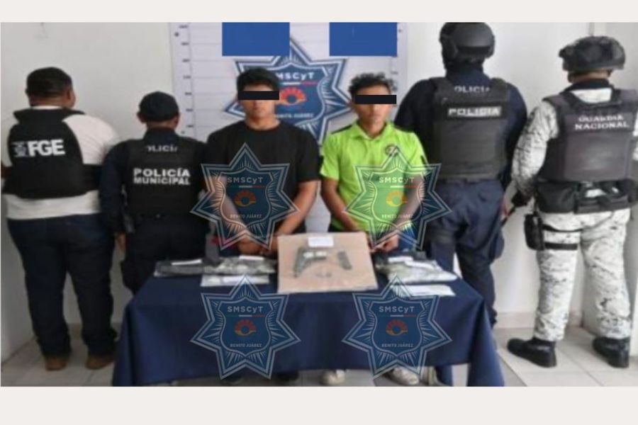 Cancún.- La Secretaría de Seguridad Ciudadana y Tránsito Municipal informó, la detención de Axel “N”, de 18 años, y Saúl “N”, de 25, quienes fueron asegurados en posesión de un arma de fuego y presuntas sustancias ilícitas, según datos oficiales.