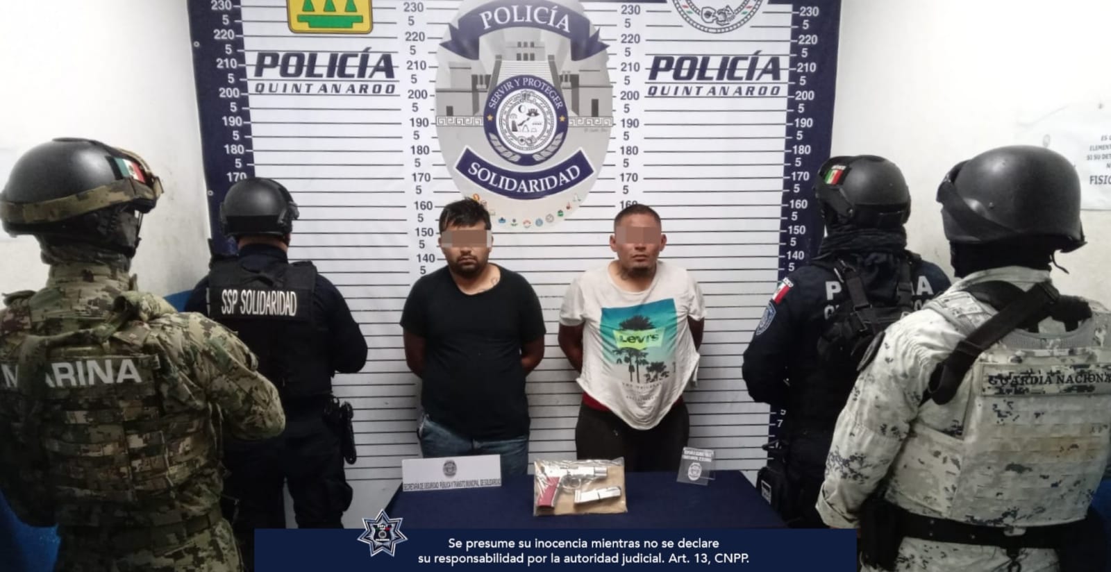Playa del Carmen.- En una pronta respuesta a un reporte de una persona lesionada y detonaciones de arma de fuego al 9-1-1, policías de la Secretaría de Seguridad Pública y Tránsito Municipal de Solidaridad, MARINA, SEDENA, Guardia Nacional y Policía Quintana Roo, aseguraron a 2 sujetos en posesión de un arma de fuego en el fraccionamiento el Petén.