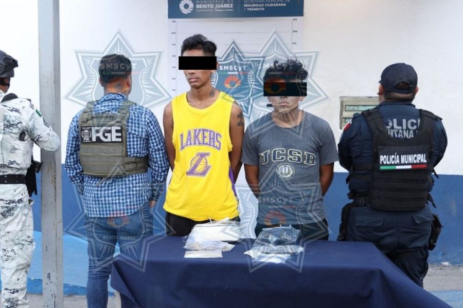 Los detenidos, identificados como Carlos José “N”, de 19 años, y César Ernesto “N”, de 26, portaban 30 dosis de hierba seca con características similares a la marihuana, así como 25 envoltorios con una sustancia cristalina, presuntamente metanfetamina (cristal), considerada una droga altamente adictiva y con severos efectos en la salud pública.