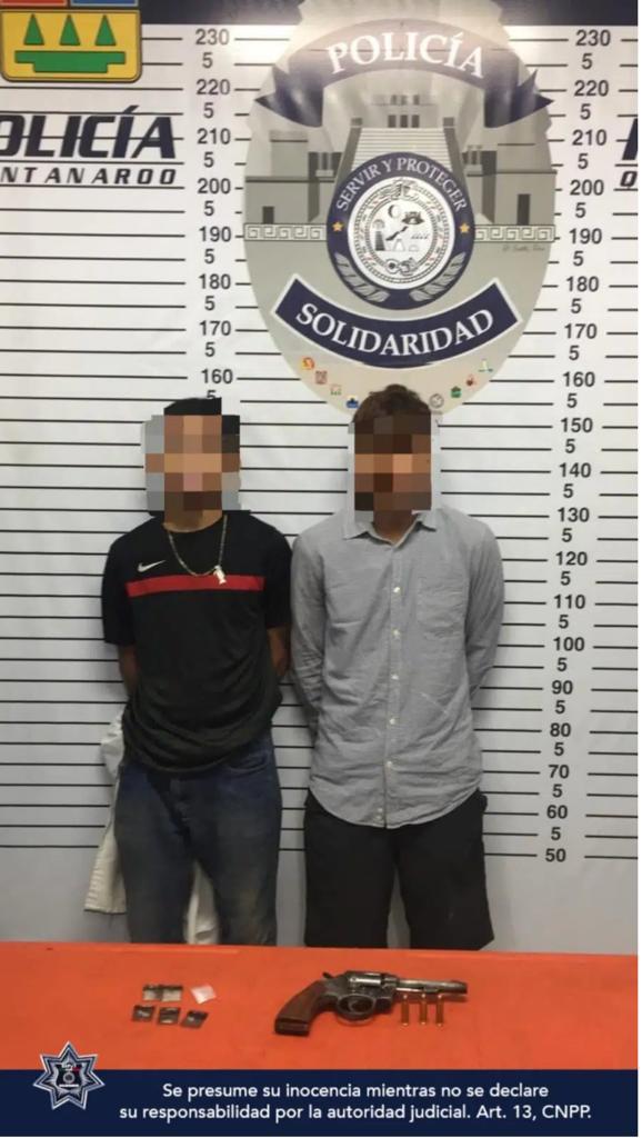 Dos menores de edad fueron detenidos por policías de Solidaridad la madrugada de hoy 6 de marzo, en posesión de un arma de fuego, tres cartuchos y diversos narcóticos.