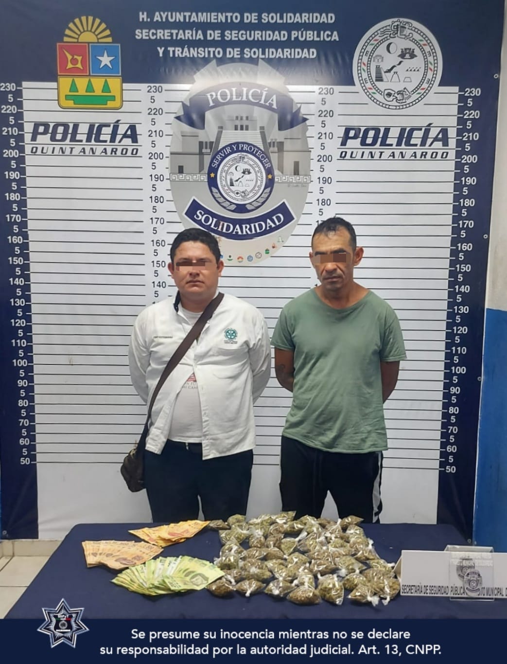 PLAYA DEL CARMEN.- A través del Grupo de Coordinación para la Construcción de Paz y Seguridad en Quintana Roo, se realizó el aseguramiento de dos sujetos en posesión de 53 bolsas con posible marihuana y 20 mil pesos en efectivo cuando pretendían salir del municipio a bordo de un taxi.