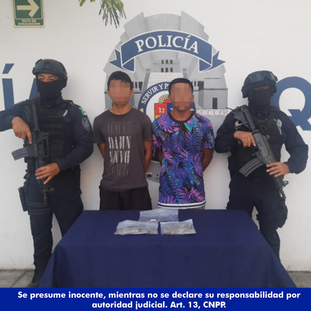 SOLIDARIDAD.- Elementos de la Policía Quintana Roo, realizaron la detención de los menores P.A.C.J. “N” y J.A.P. “N”, por su probable participación en delitos contra la salud, en la Av. del Paraíso de la colonia Misión de las Flores, del municipio de Solidaridad, a quienes les aseguraron un cigarro blanco con hierba seca similar a la mariguana y 11 bolsitas con vegetal verde similar a la marihuana.