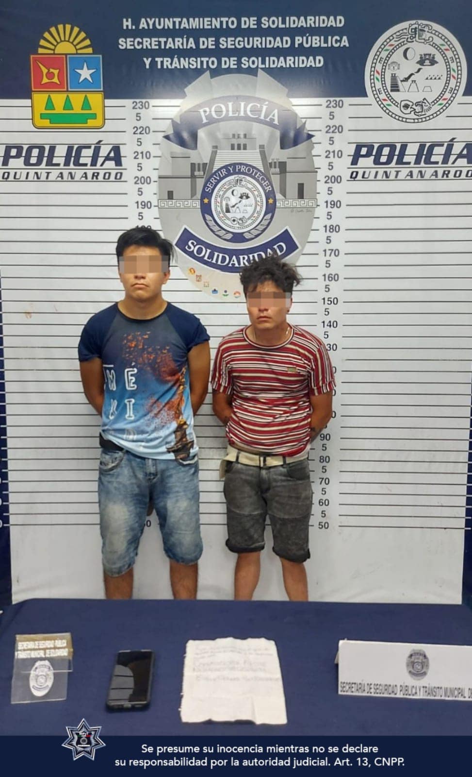 Como resultado de una respuesta inmediata, policías de la Secretaría de Seguridad Pública y Tránsito Municipal de Solidaridad aseguraron a dos personas por el posible delito de extorsión al ser señaladas de querer cobrar derecho de piso en un negocio ubicado sobre la avenida 10.