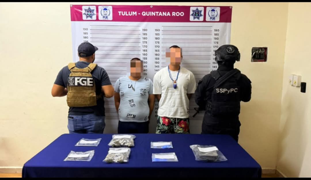 Tulum.- Dos hombres identificados como Dylan Humberto C. B., originario de la Ciudad de México, y Luis Enrique R. R. fueron detenidos en la zona hotelera de Tulum en posesión de diversas dosis de droga. Ambos son señalados como presuntos integrantes del grupo criminal “Los Pelones”, uno de los principales generadores de violencia en el municipio.