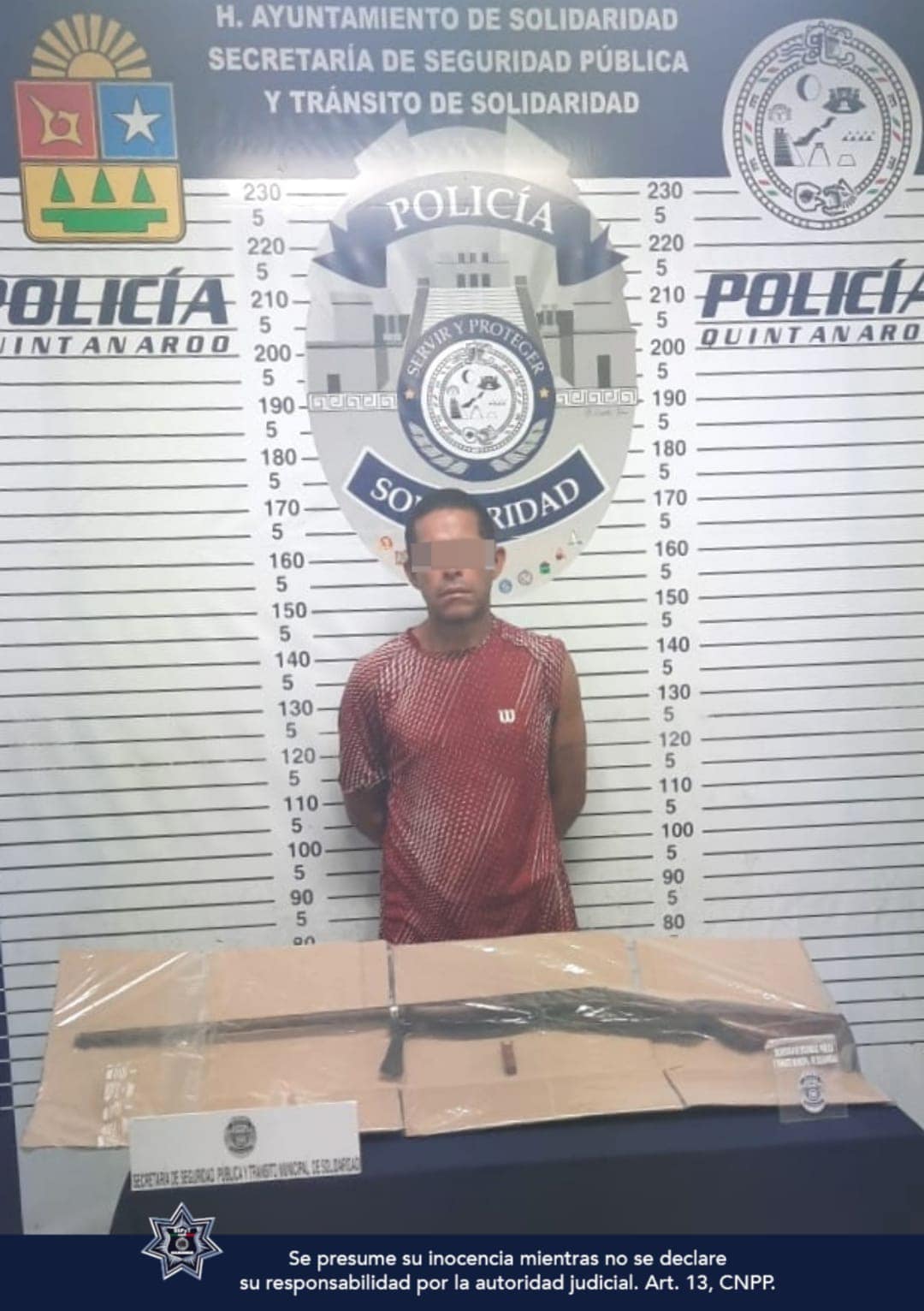 Policías de la Secretaría de Seguridad Pública y Tránsito Municipal de Solidaridad aseguraron a un sujeto y una escopeta en la localidad de Nuevo Noh Bec, en una inmediata atención a reportes al 9-1-1 por detonaciones de arma de fuego.
