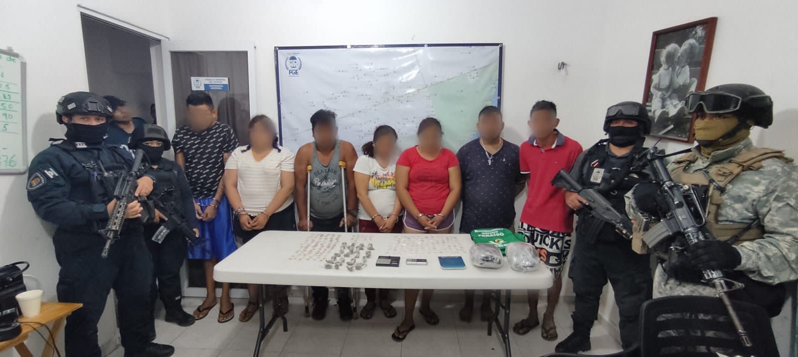 Los detenidos son: Maricela “S” de 20 años, originaria de Tabasco; Concepción “J” de 41 años, originaria de Tabasco; Belem “J” de 25 años, originaria de Tabasco; Rene “P” de 37 años, originario de Chiapas; Bernardo “S” de 22 años, originario de Veracruz, José “J” de 27 años, originario de Tabasco y Luis “L” de 23 años, originario de Quintana Roo.