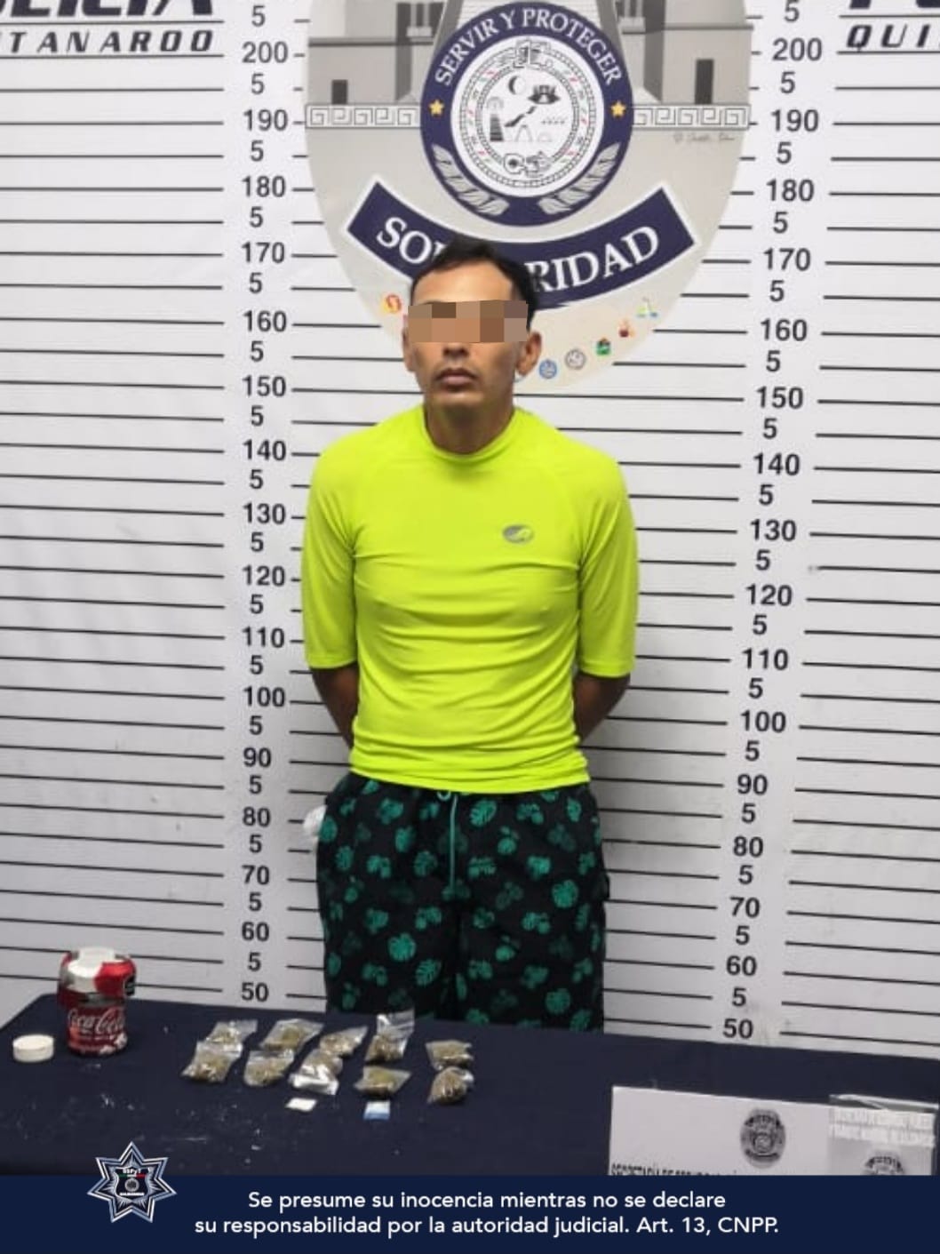 Playa del Carmen.- Policías de la Secretaría de Seguridad Pública y Tránsito Municipal aseguraron a una persona en posesión de posible marihuna, cocaína y piedra en la zona turística de la colonia Centro, cuando realizaban patrullaje de proximidad.