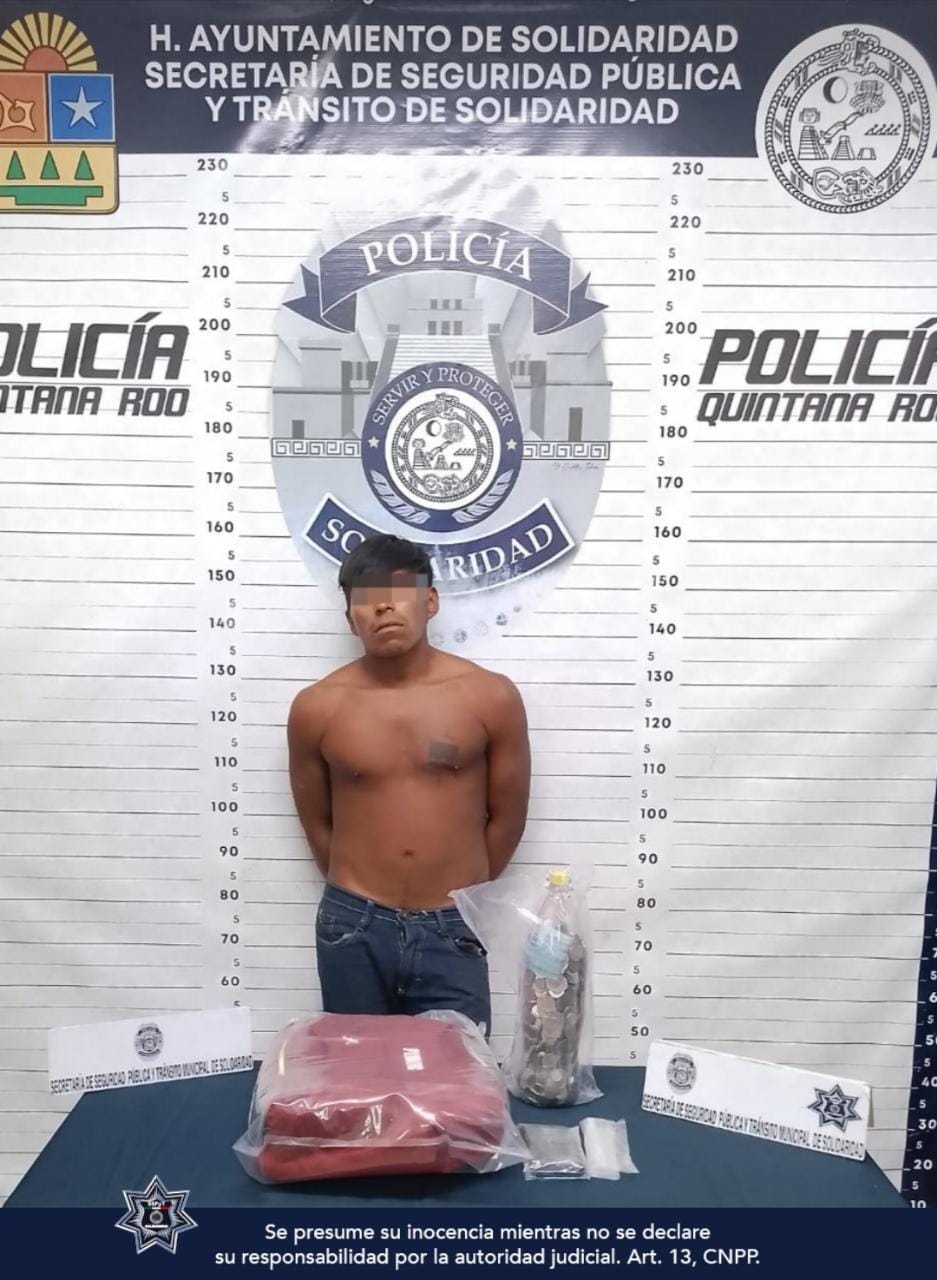 Playa del Carmen.- Policías de la Secretaría de Seguridad Pública y Tránsito Municipal de Solidaridad aseguraron a un sujeto por el posible delito de robo a casa habitación en la colonia Nuevo Noh Bec.