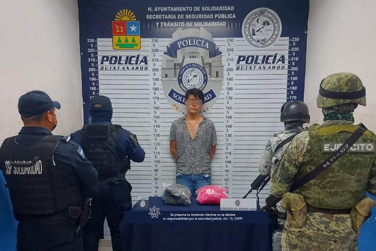 Playa del Carmen, Solidaridad.- Al implementar un puesto de inspección preventiva en el fraccionamiento Villas del Sol, entre elementos de la Secretaría de Seguridad Pública y Tránsito Municipal, SEDENA, Guardia Nacional y Policía Quintana Roo, una persona fue asegurada en posesión de posible marihuana.