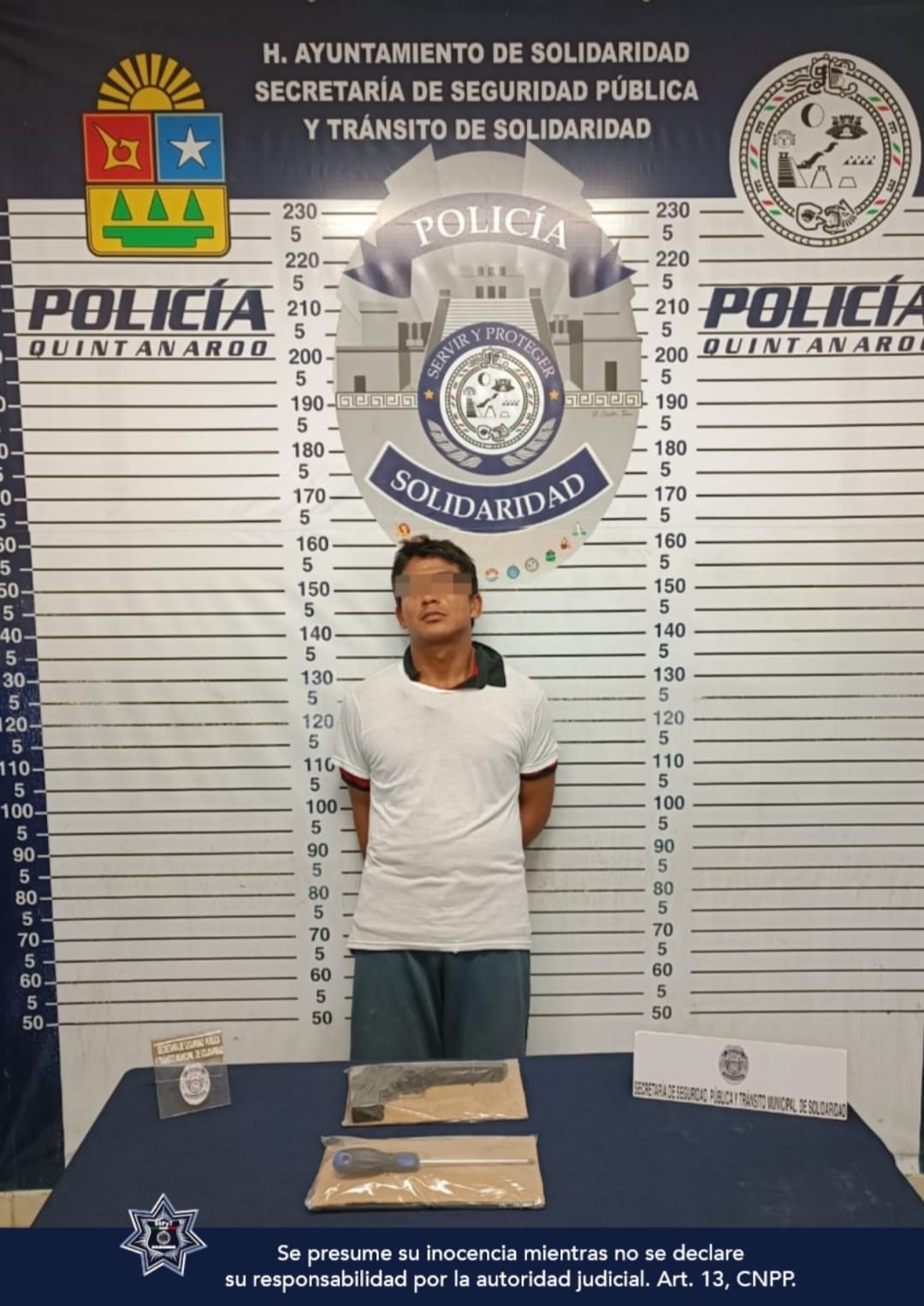 Playa del Carmen, Solidaridad.- Derivado del trabajo coordinado entre la Policía Preventiva y la Policía Turística de la Secretaría de Seguridad Pública y Tránsito Municipal de Solidaridad, fue asegurado un sujeto por la posible comisión del delito de robo, asimismo llevaba una réplica de arma de fuego.