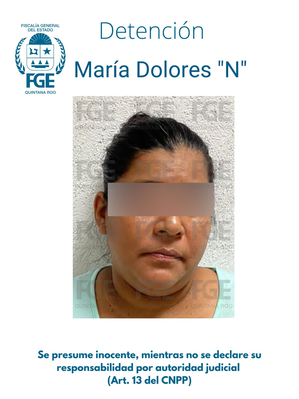 Por tal motivo, la Fiscalía Especializada en Homicidios obtuvo de un Juez de Control la orden de aprensión en contra de María Dolores “N”, la cual fue cumplimentada por agentes de la Policía de Investigación en la calle 52 norte con avenida 10, de la colonia Luis Donaldo Colosio del municipio de Solidaridad.