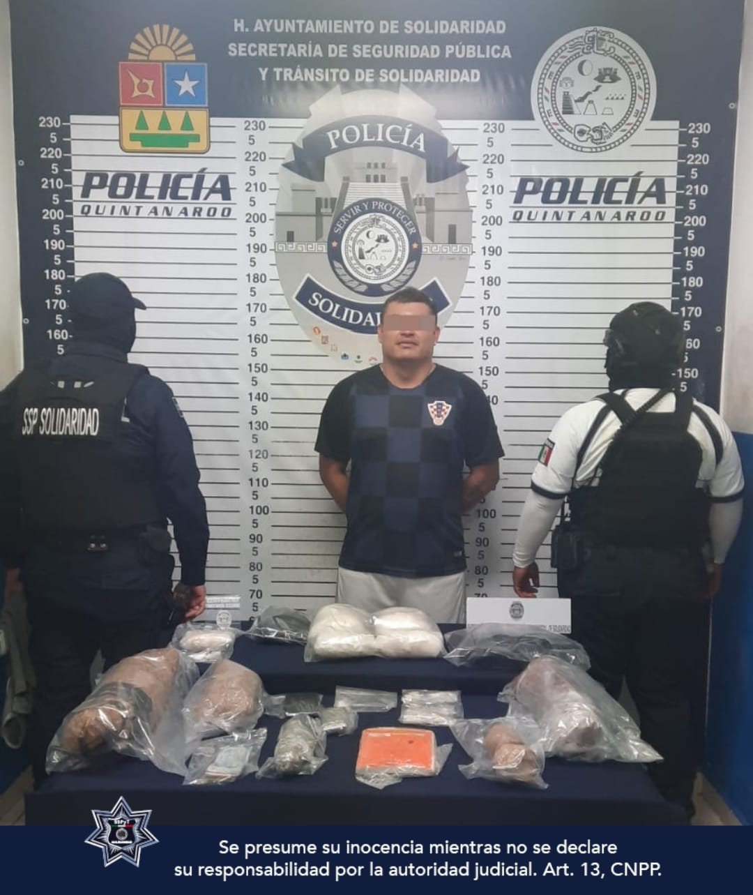 Playa del Carmen, Solidaridad .- En pronta respuesta a una denuncia por presunta posesión de droga, policías de la Secretaría de Seguridad Pública y Tránsito Municipal de Solidaridad, aseguraron a un sujeto en posesión de paquetes, envoltorios y bolsitas con posibles narcóticos como marihuana, cocaína, cristal y crack en el fraccionamiento Xcacel.