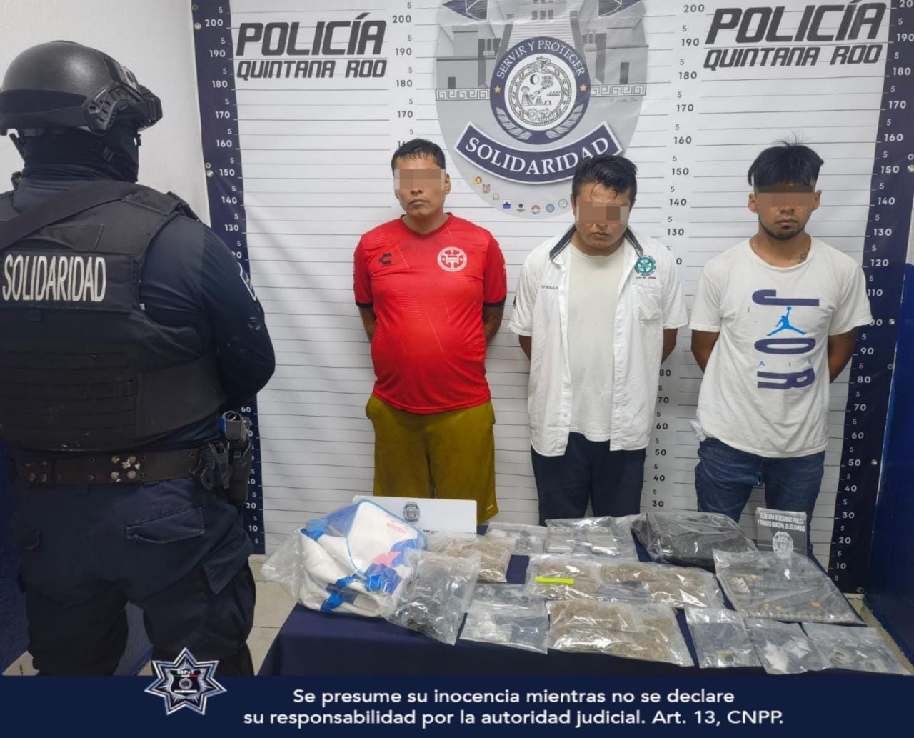 Playa del Carmen.- Tres personas fueron aseguradas por policías de la Secretaría de Seguridad Pública y Tránsito Municipal de Solidaridad en posesión de 47 envoltorios con posibles narcóticos, asimismo se aseguraron dos vehículos habilitados como taxi donde los sujetos pretendían huir, durante el operativo permanente de vigilancia en el fraccionamiento Villas del Sol.
