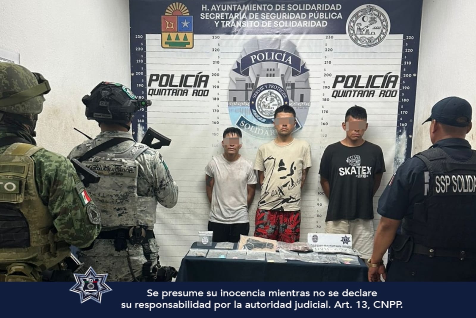 PLAYA DEL CARMEN.- Detienen a tres personas que tenían en su posesión un arma de fuego y posibles dosis de drogas como metanfetamina y marihuana en la colonia Centro de esta ciudad.