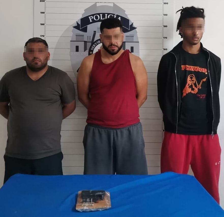 Cancún.- Oficiales de la Secretaría Municipal de Seguridad Pública y Tránsito de Benito Juárez, bajo el mando del Capitán de Corbeta IM, José Pablo Mathey Cruz, lograron la detención de tres masculinos que se identificaron como Elrafie “N” de 30 años, Iggy “N” de 29 años y Ameil “N” de 29 años de edad, por su probable participación en el delito de portación de arma de fuego.