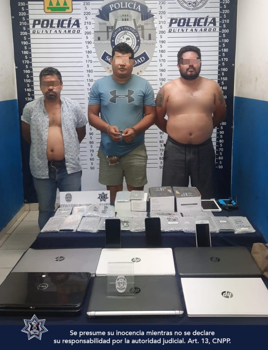 Los sujetos identificados como Luis “N” de 24 años de edad, originario de Chiapas, Armando “N” de 41 años de edad y Erick “N” de 28 años de edad, ambos originarios de Tabasco, tenían en su posesión 31 teléfonos celulares, 6 laptops, 2 tablets, 1 mochila, 1 memoria, 1 cargador, 1 bolsa con herramientas y 2 cajas que el denunciante reconoció como de su propiedad.