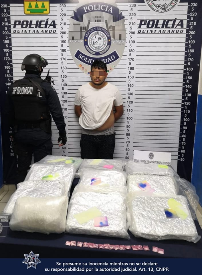 Playa del Carmen.- Policías de la Secretaría de Seguridad Pública y Tránsito Municipal de Solidaridad, aseguraron a un sujeto en posesión de 9 paquetes con posible marihuana envueltos con aluminio, 17 bolsitas y 1 envoltorio con posibles narcóticos, en el fraccionamiento Selvanova.