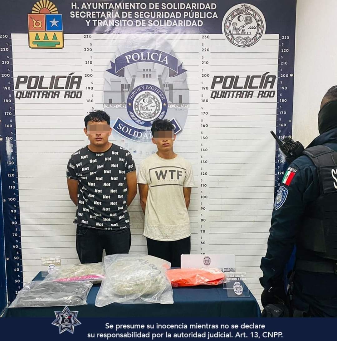 Playa del Carmen.- Policías de la Secretaría de Seguridad Pública y Tránsito Municipal de Solidaridad aseguraron a 2 sujetos en posesión de posibles narcóticos durante el operativo de vigilancia en el fraccionamiento Misión de las Flores.