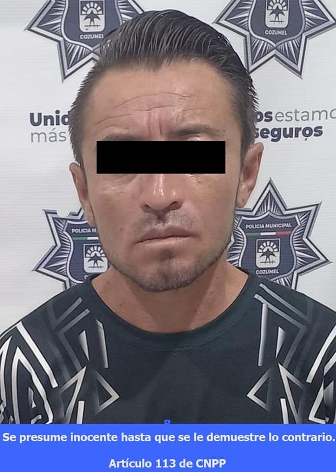 Policías municipales encontrándose en labor de prevención del delito y resguardando el primer cuadro de la isla debido a las fiestas del carnaval recibieron reporte en el que se había ubicado a través de las cámaras que operan en la base de la Secretaría de Marina a un masculino con historial delictivo ingresando al parque Benito Juárez con actitud sospechosa, por lo que a la brevedad acuden a la ubicación señalada, poco después de la búsqueda en la zona observan a un sujeto que cumplía con las características proporcionadas vistiendo playera negra con manga larga y franjas blancas, pantalón gris, sandalias negras, tés clara, delgado con barba de candado y un antifaz de mariposa negro, también cargaba una cangurera verde camuflaje.