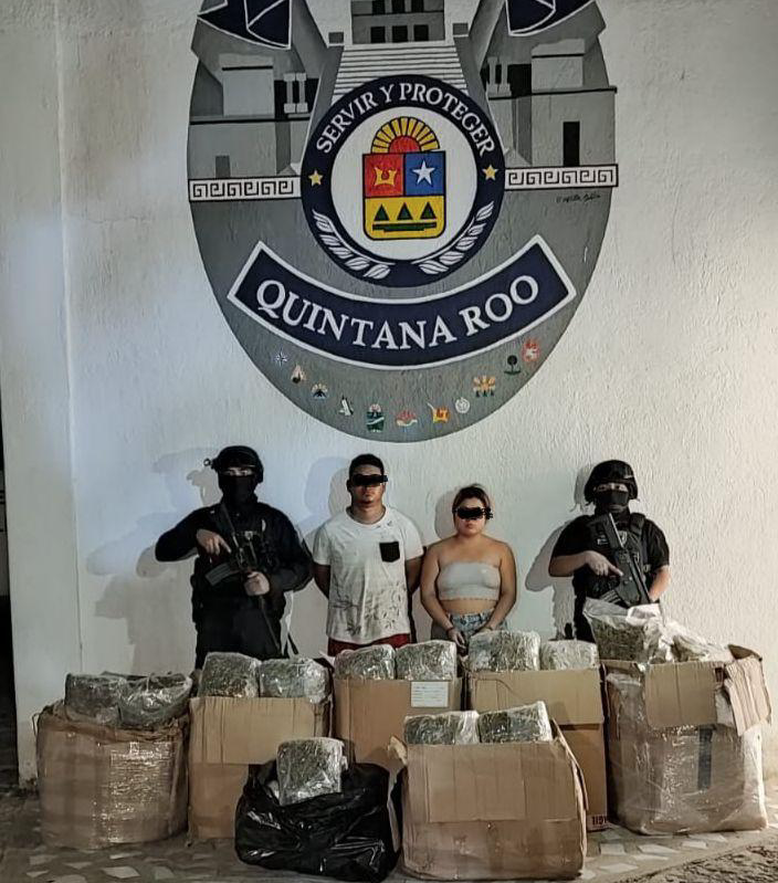 PLAYA DEL CARMEN.- Una pareja fue detenida en Playa del Carmen por los elementos de la policía de Quintana Roo, donde lograron confiscar 65 kilos de marihuana en 124 paquetes, en el Fraccionamiento Villas del Sol.