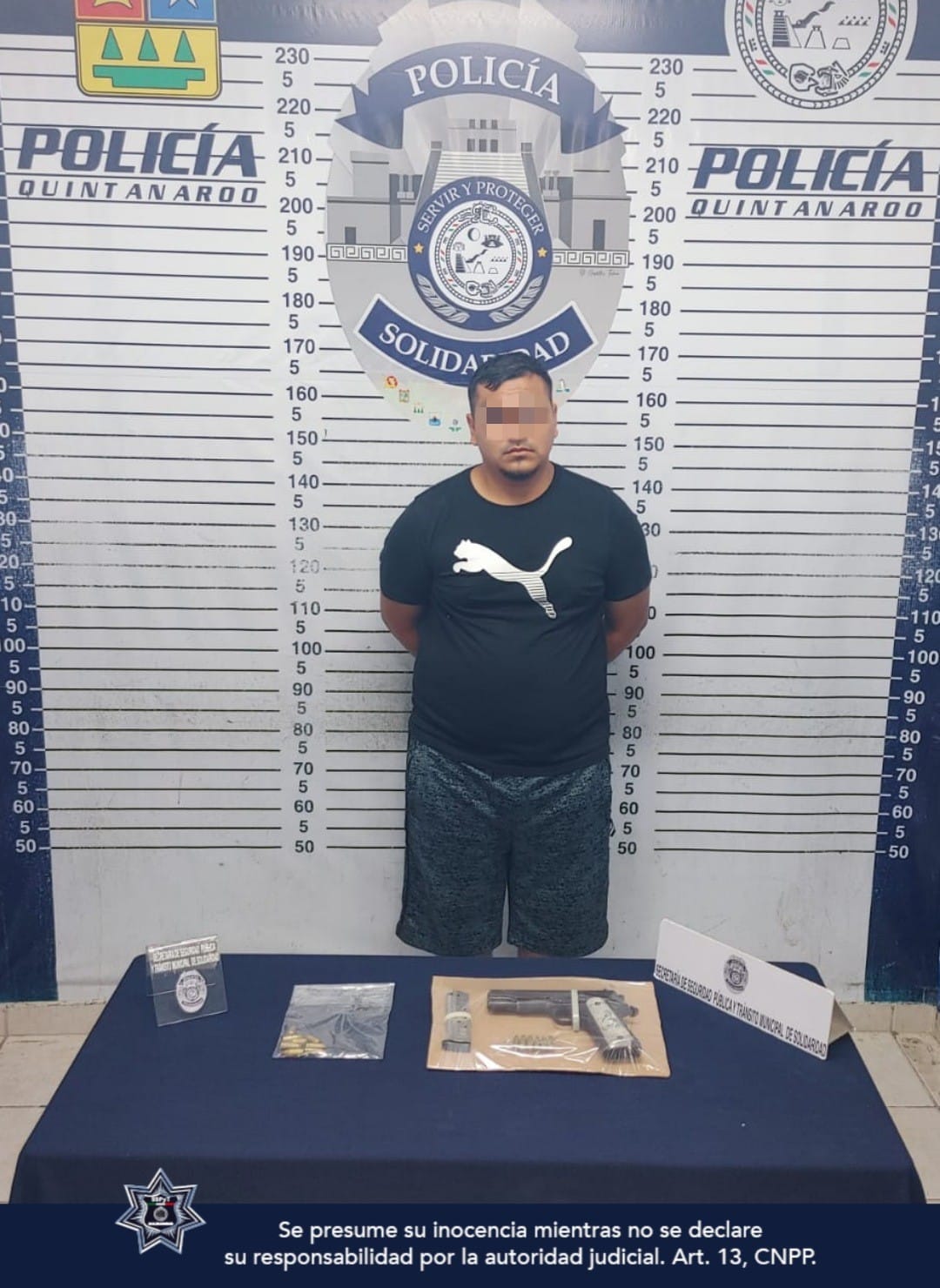 Playa del Carmen.- Policías de la Secretaría de Seguridad Pública y Tránsito Municipal de Solidaridad aseguraron a un sujeto en posesión de un arma de fuego, un cargador y 14 cartuchos útiles en el fraccionamiento Villas del Sol.