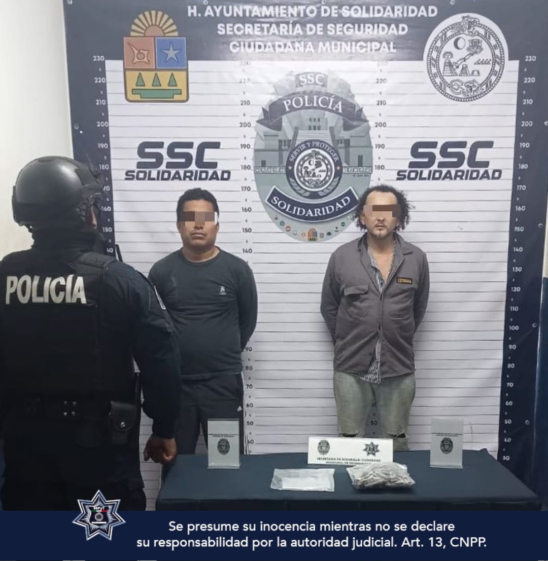 PLAYA DEL CARMEN.- En respuesta a una llamada al 9-1-1, Policías Municipales de Solidaridad aseguraron a dos sujetos y más de 20 envoltorios con posible marihuana en la colonia irregular In House.