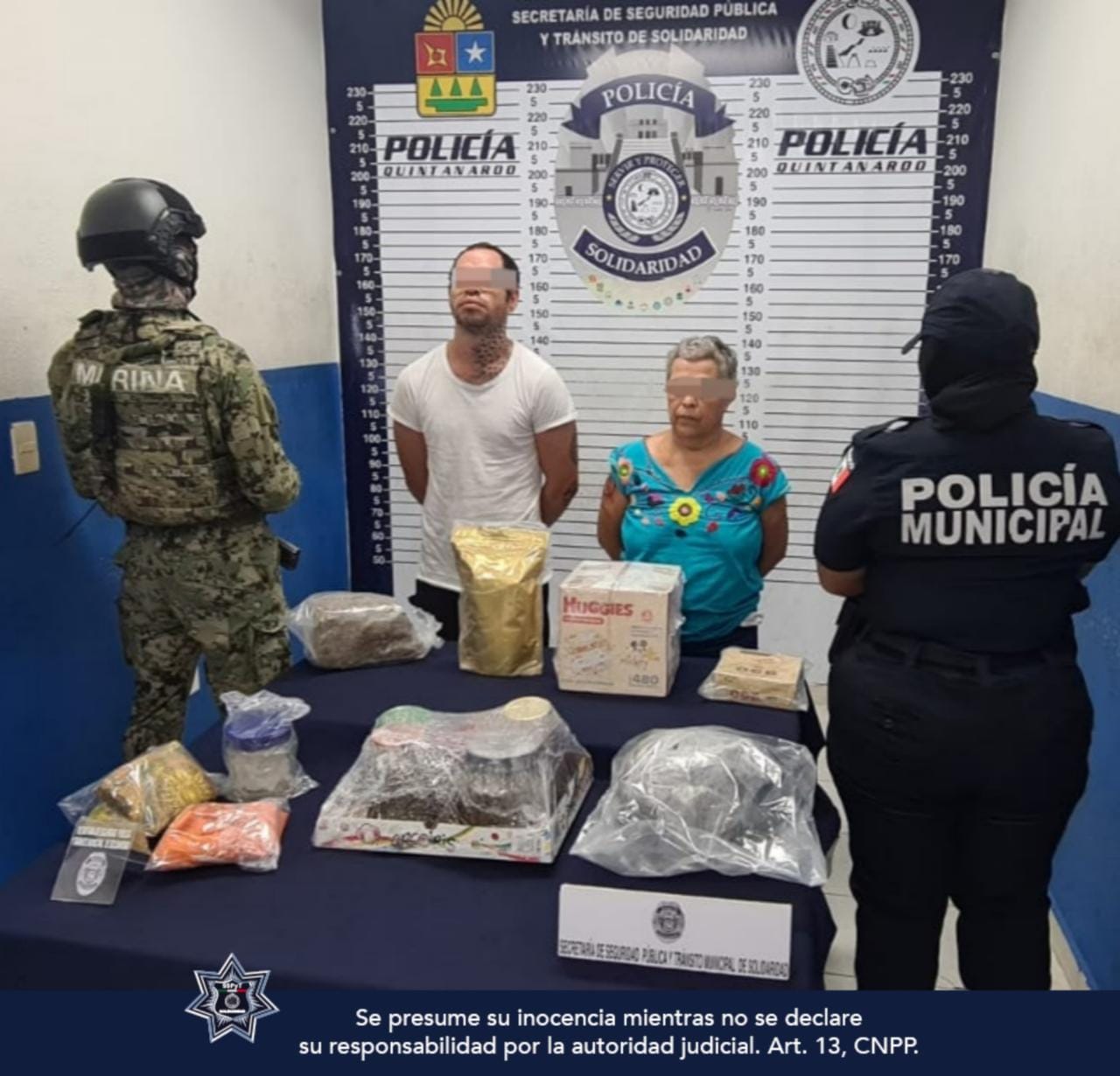 Playa del Carmen .- Policías de la Secretaría de Seguridad Pública y Tránsito Municipal de Solidaridad y elementos de la MARINA, aseguraron a un hombre y una mujer en posesión de paquetes, frascos y cajas que contenían vegetal verde y seco con las características de la droga conocida como marihuana y una sustancia granulada cristalina con las características propias de la droga conocida como cristal, en la colonia Luis Donaldo Colosio.