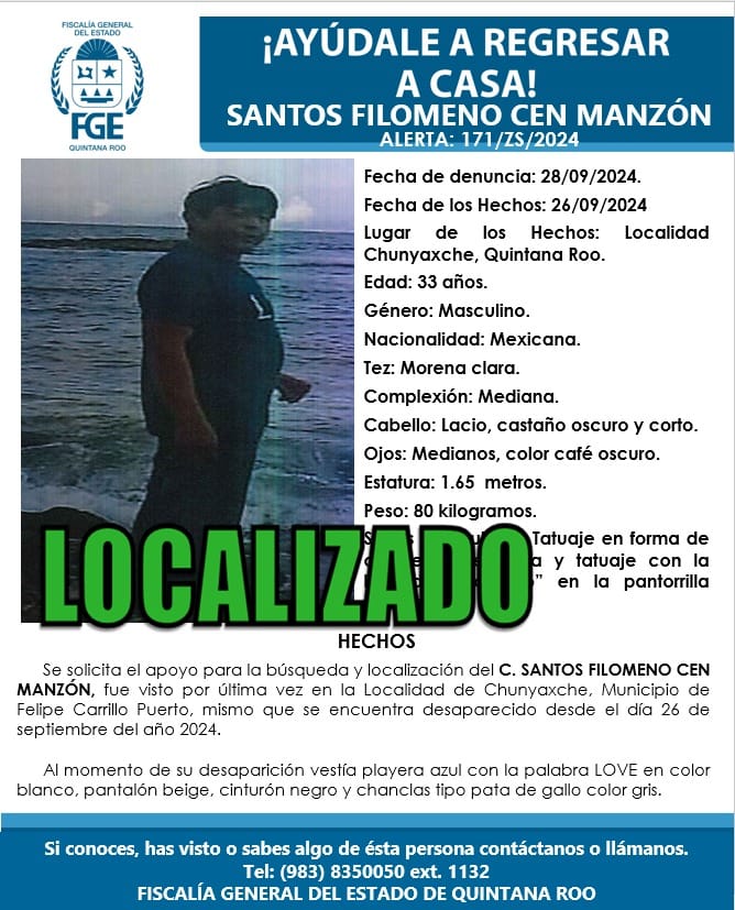 Felipe Carrillo Puerto.- Santos Filomeno Cen Mazón, de 33 años, fue encontrado con vida cuatro días después de haber sido reportado como desaparecido el pasado 26 de septiembre en la comunidad de Chunyaxché, Felipe Carrillo Puerto.