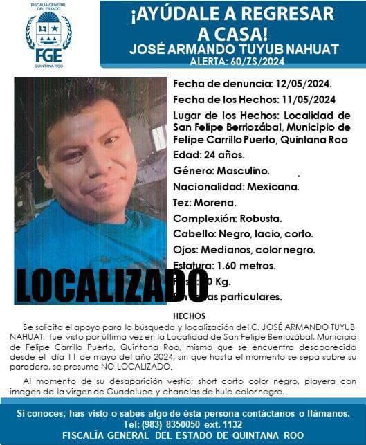 La Fiscalía General del Estado, difundió el pasado 12 de mayo la ficha de búsqueda, marcado con el número 60/ZS/2024, y la última vez que fue visto, fue el pasado 11 de mayo.