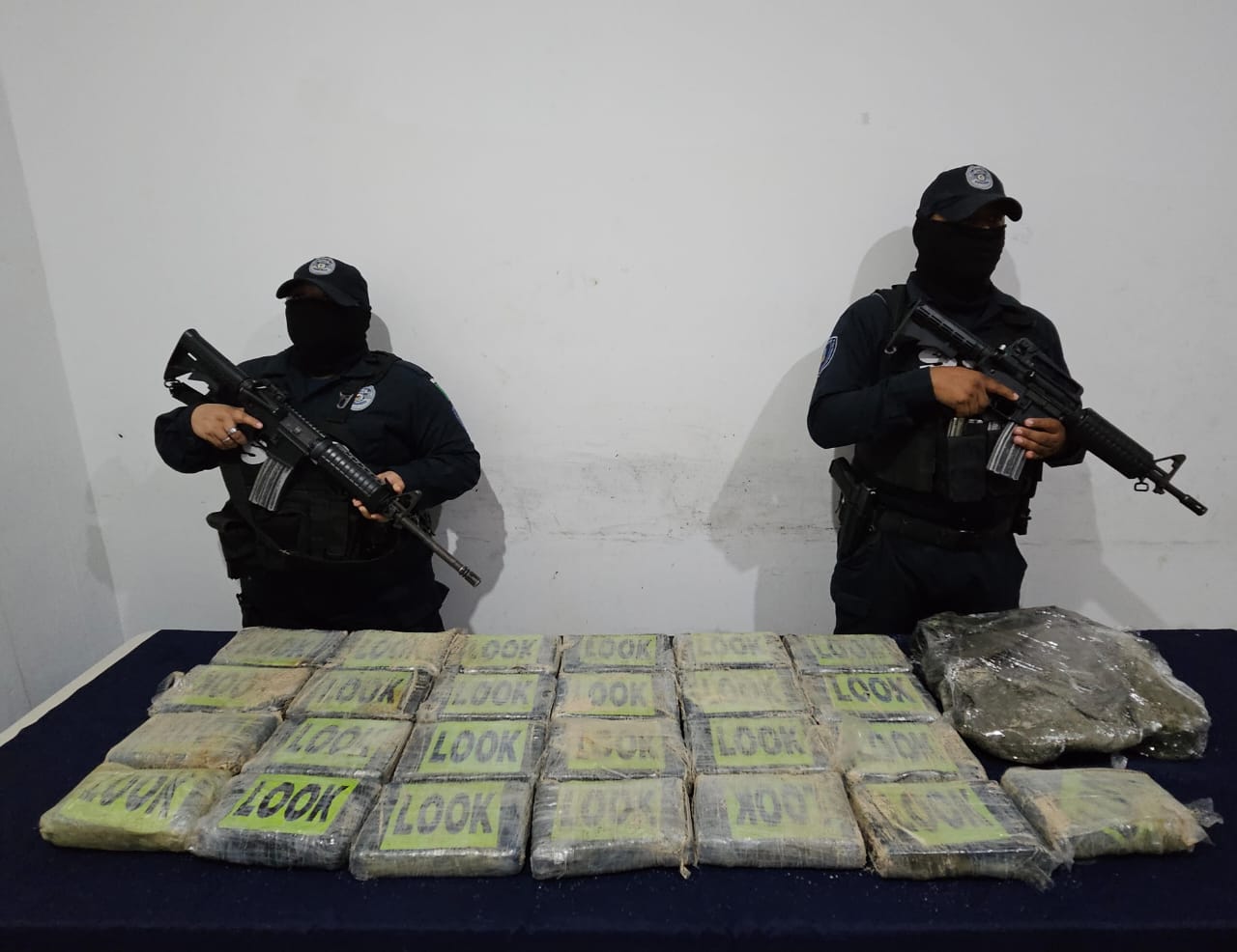 En total fueron asegurados 25 paquetes de presunta droga con un peso aproximado de 30 kilogramos, los cuales en un costado tenían una etiqueta color verde con letras color negro con la leyenda “Look”.