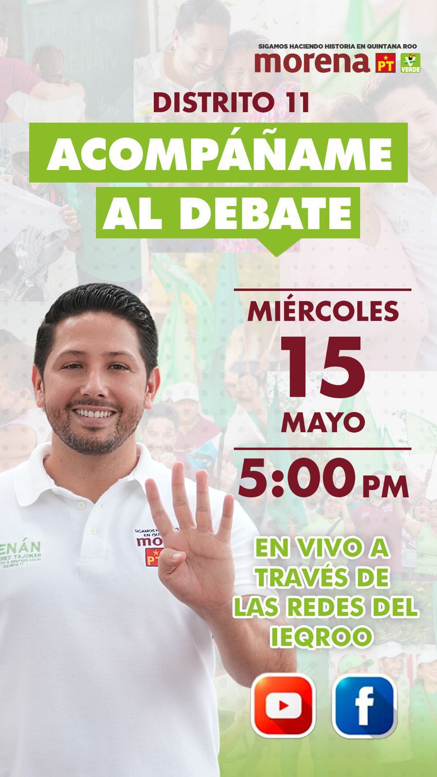 El candidato a diputado por el Distrito 11 de la coalición “Sigamos Haciendo Historia en Quintana Roo”, participará en el debate que se llevará a cabo este miércoles 15 de mayo a las 5 de la tarde, el cual es organizado por el Instituto Electoral de Quintana Roo (IEQROO), y será transmitido por el Sistema Quintanarroense de Comunicación Social, y en redes sociales oficiales.