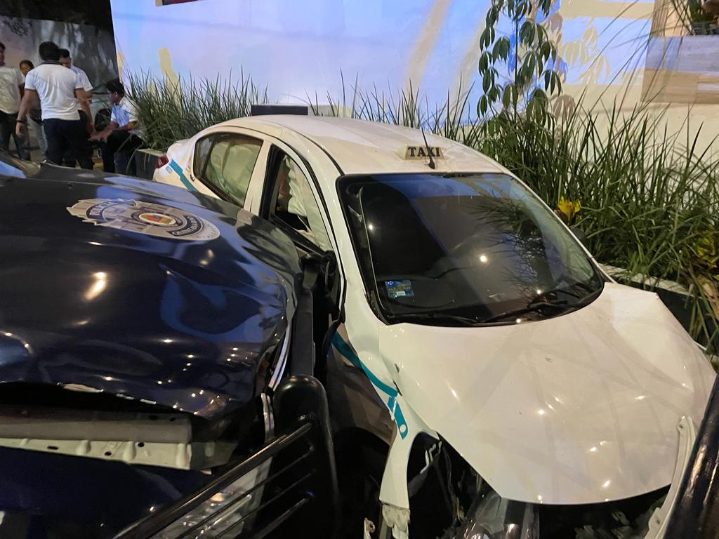 Playa del Carmen.- Una pasajera, aparentemente de origen extranjero, resultó lesionada, esto luego que el taxi en el que viajaba terminara impactado por un patrulla de la Policía Municipal.