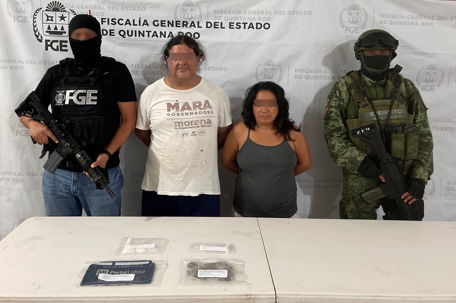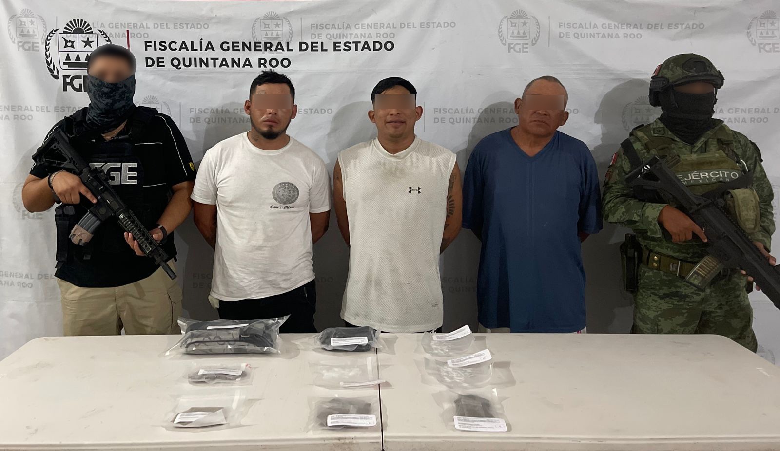 CANCÚN.- La Fiscalía General del Estado informa que, derivado de actos de investigación, en colaboración con la Secretaría de la Defensa Nacional (Sedena) y la Guardia Nacional, cumplimentó, -por separado- tres órdenes de cateo giradas por jueces de control, dos en este municipio y uno más en Othón P. Blanco, en los que aseguraron diversos tipos de sustancias ilícitas.